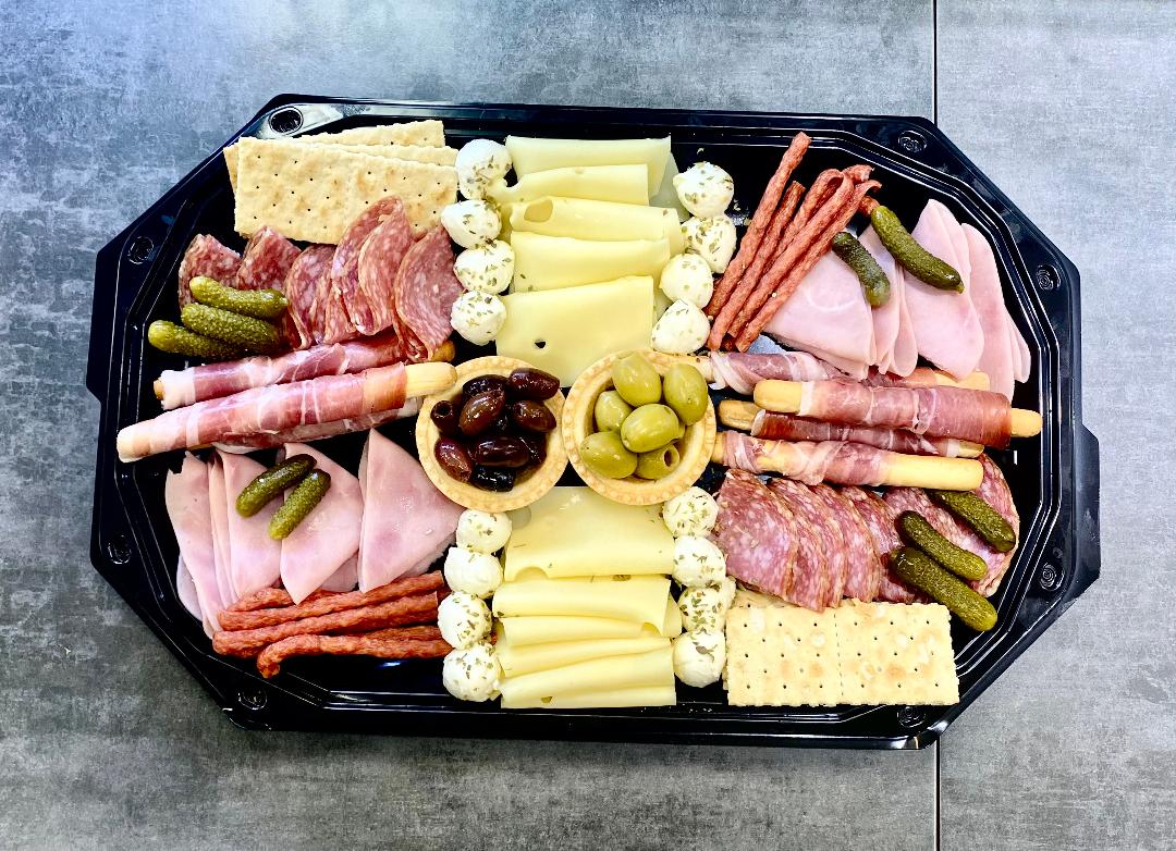 Conține: Prosciutto crudo,sunca presata, salam uscat, bacon, cascaval, Trufe cu gorgonzola,pastrama pui,rosii cherry, castraveti, masline.
