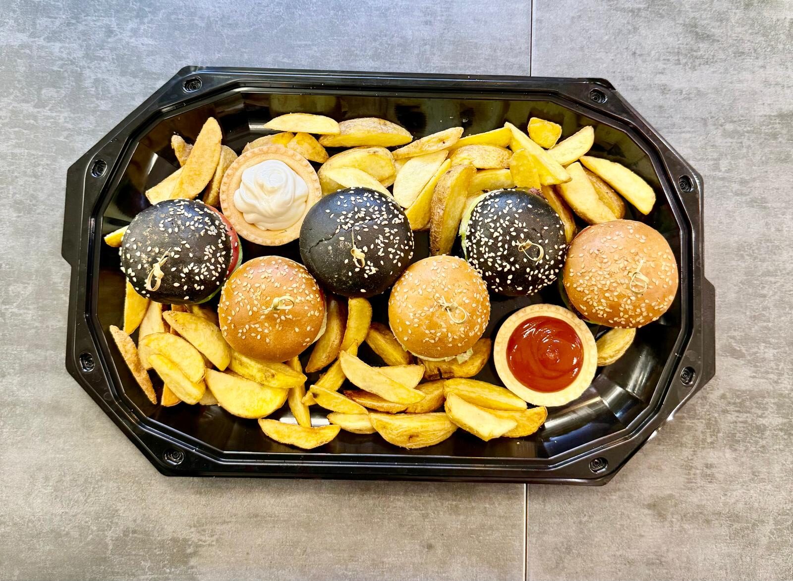 Conține: chifle burger, chiftele burger vită Angus 100%, roșii, castraveți murați, cartofi wedges, sos burger, sos Sriracha.